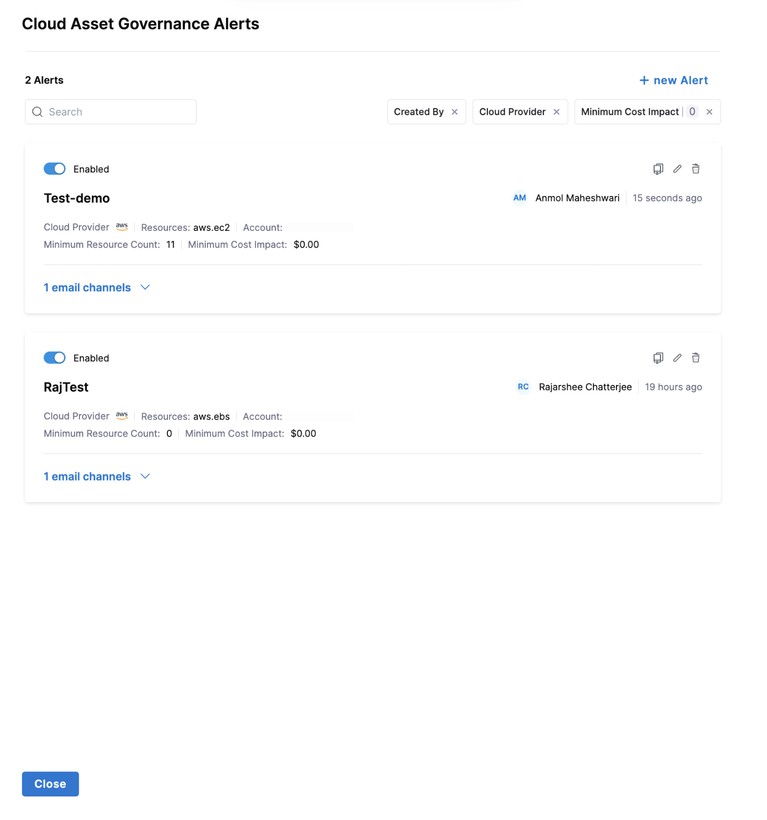 Alerts allow you to receive notifications when certain conditions are met during governance evaluations. These conditions can be fine-tuned based on cloud providers, resource types, account/subscription/project , cost impact, and resource count.
