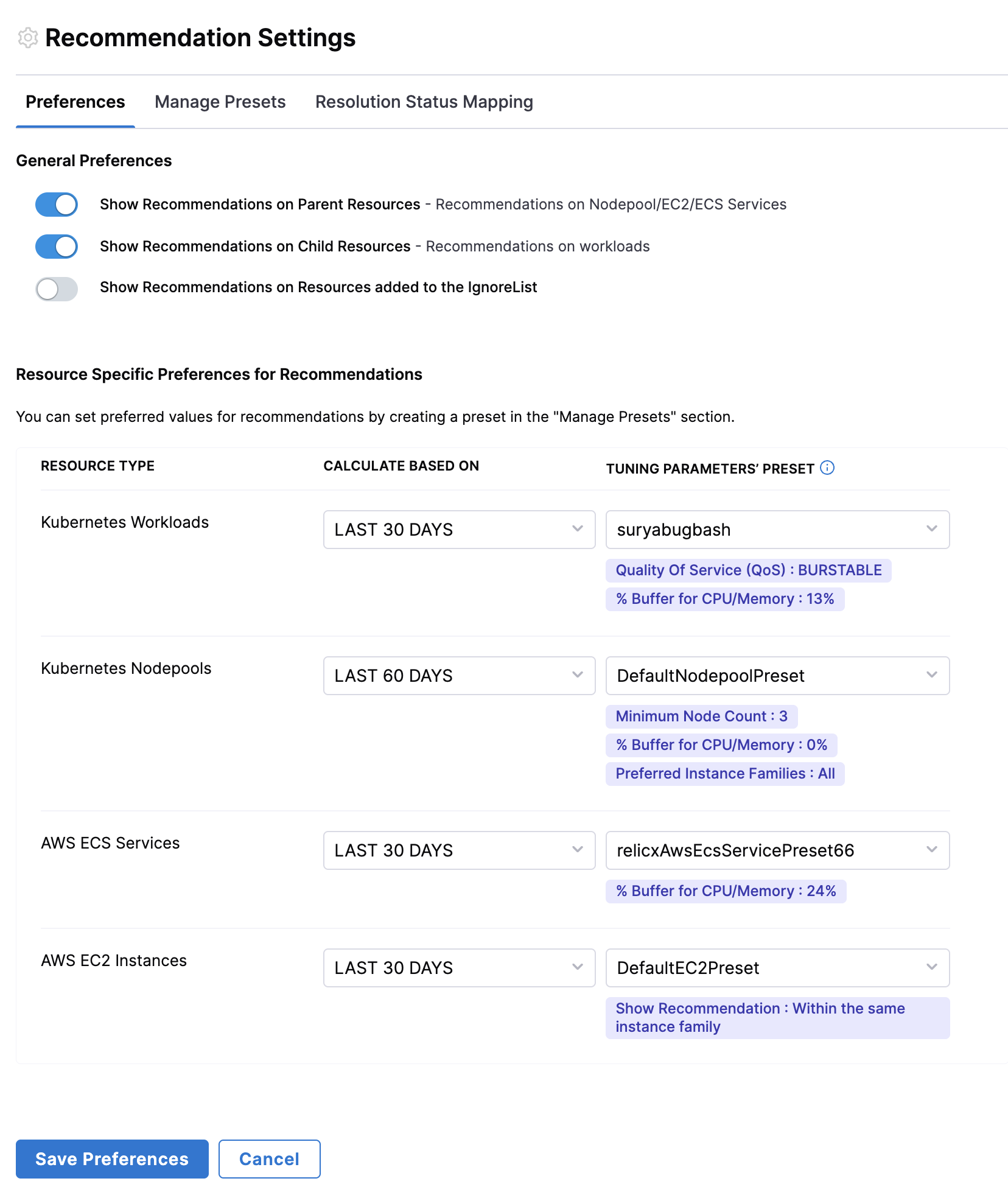 This helps users to create and save customized configurations for their recommendations. These presets capture specific user preferences, such as tuning parameters for resource types like workloads, nodepools, ECS, and EC2 instances.