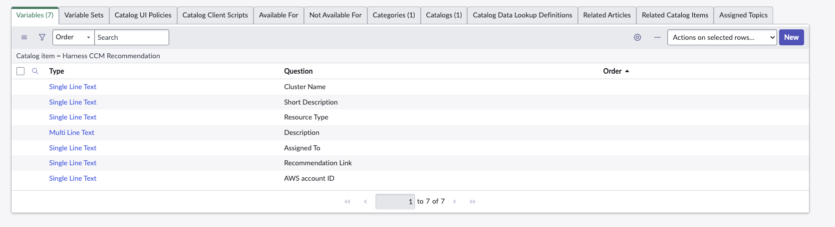 - Define a service catalog with the "Software" category. Ensure the name of the catalog item exactly matches "Harness CCM Recommendation" and mark it as Active.