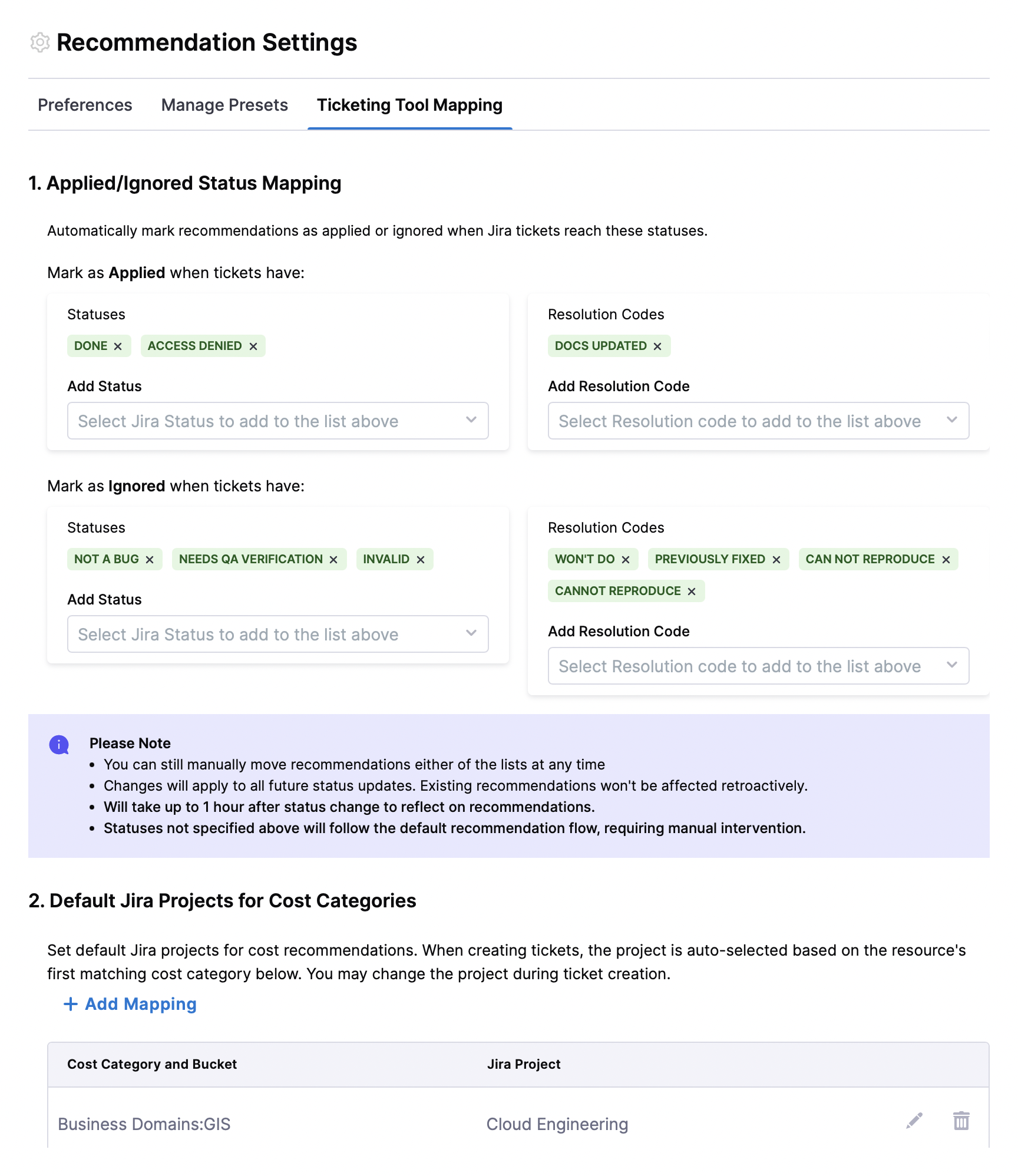 In Recommendation Settings, you can define which Jira statuses correspond to recommendations being considered Applied or moved to the Ignore List. When a linked Jira issue reaches a mapped status, the recommendation is automatically updated. You can also choose Resolution Codes with which the recommendation is automatically updated to Applied.