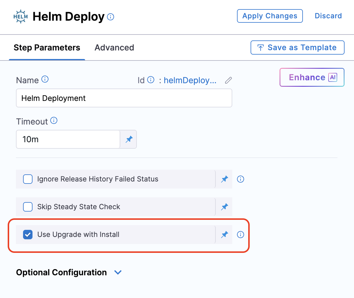 Once enabled, you’ll see a new checkbox titled Use Upgrade with Install in the Helm deployment step configuration.