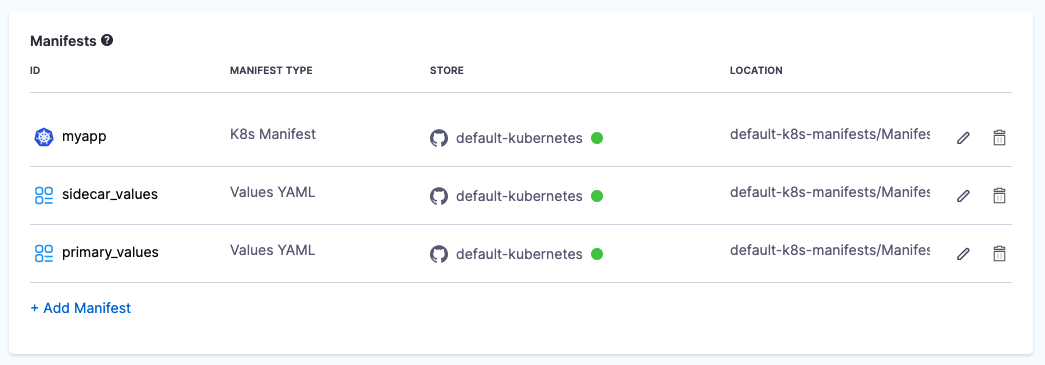 If your stage deploys both primary and sidecar resources, you add one K8s Manifest in the Manifests section that points to the folder(s) containing the primary and sidecar manifests.