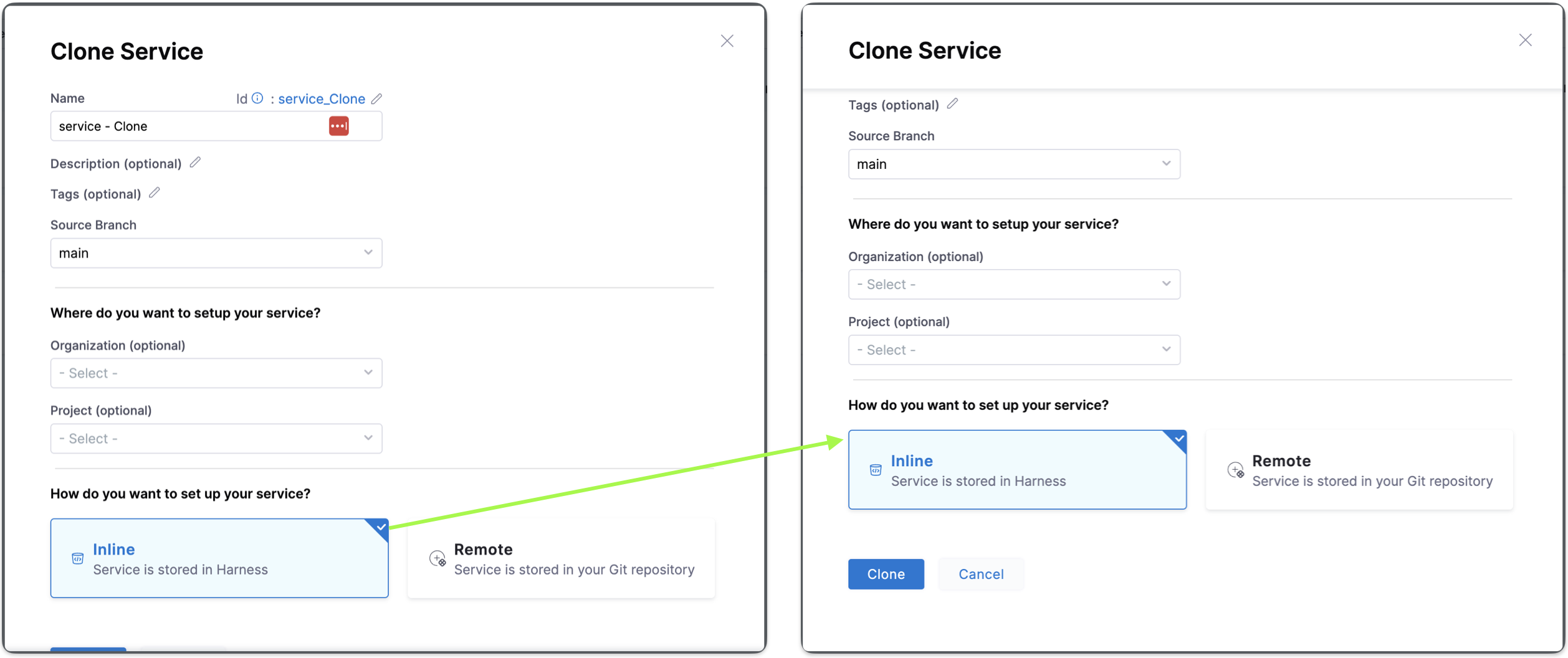 To Clone an inline service or remote service to a remote service, you must specify the target repository, Harness Code Repository, to store the service in the Harness repository or Third-party Git provider, to store the service in a third party Git provider, define the Git Connector if Third-party Git provider. Specify the Repository name, the YAML path, and the commit message.