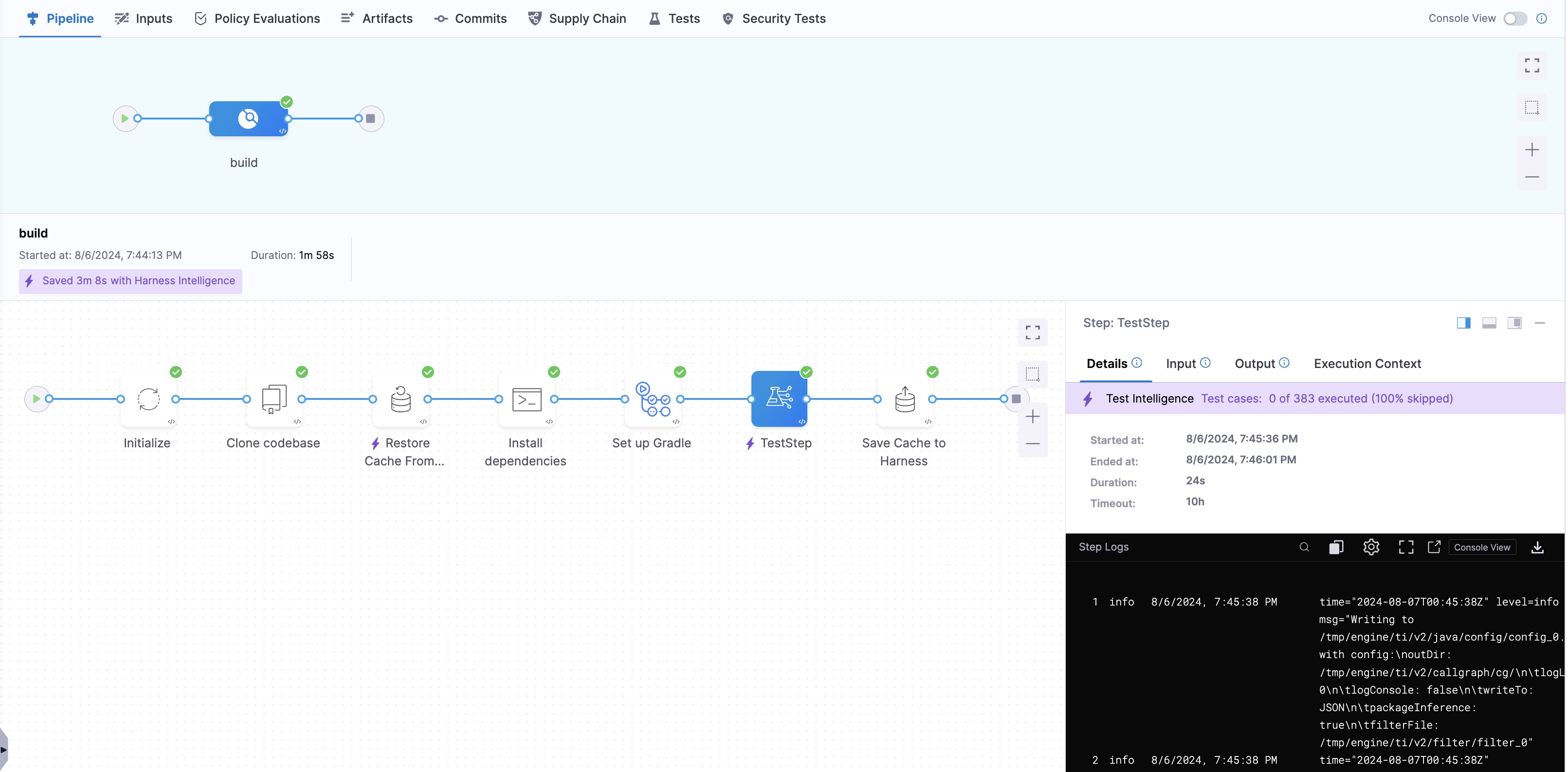 Harness Test Intelligence (TI) helps your test cycle move faster without compromising quality. Harness TI speeds up builds by running only the unit tests that matter for the specific code changes made, instead of executing the entire test suite every time. It automatically identifies and selects the relevant tests, skipping the rest. You can also configure TI to split tests across multiple jobs and run them in parallel, further reducing test time.