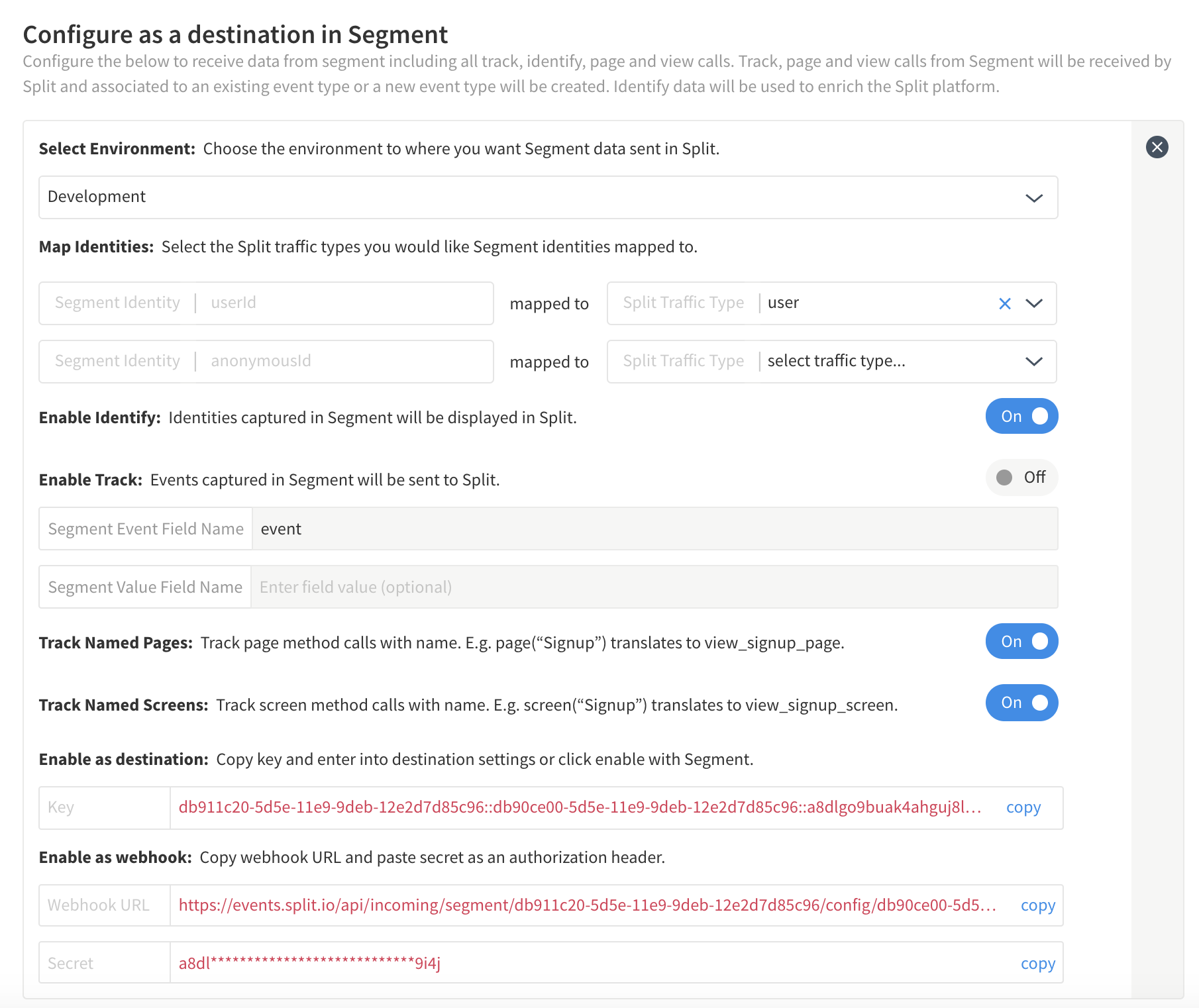 - Enable identify: When enabled, identities captured in Segment are mapped to the traffic types you selected above and displayed in Harness FME.
