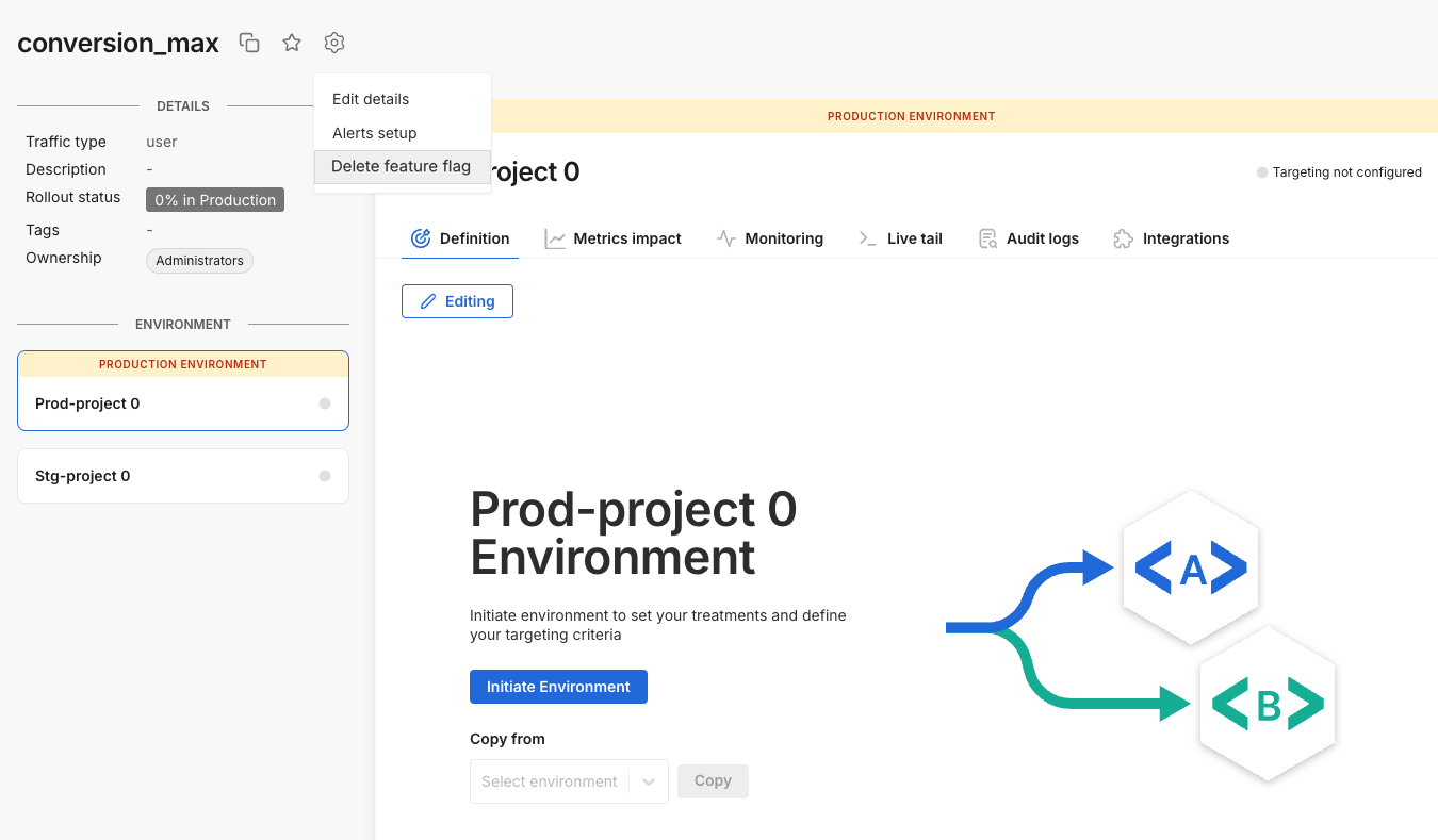 • To delete a feature flag, delete all the definitions from its environments.