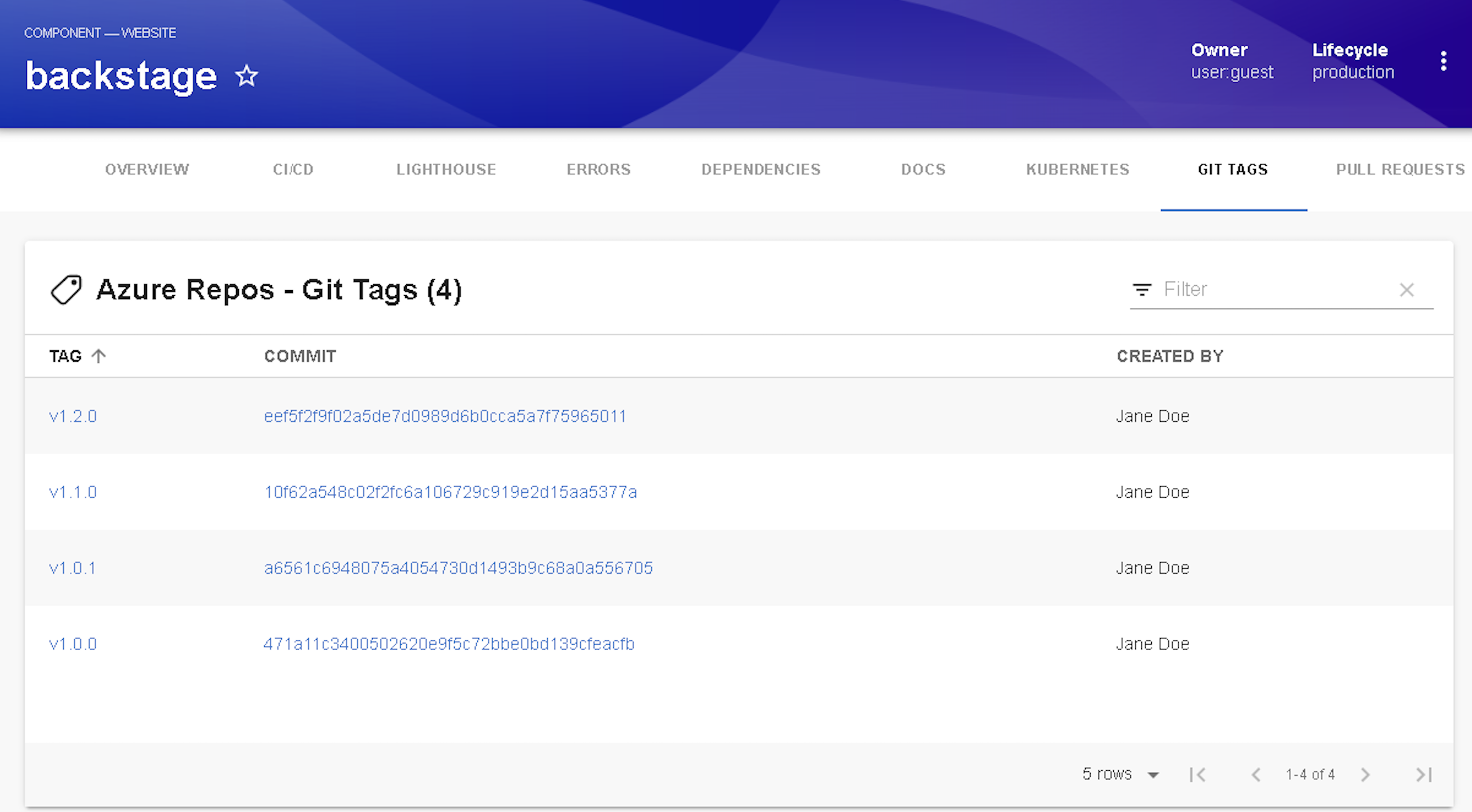 This plugin exports an overview page card, UI tab that you can use as a new CI/CD tab for a service or for any other layout page and a Git Tags page. Go to Admin > Layout, select Service in the dropdown menu, and you can view this YAML code in the CI/CD section: