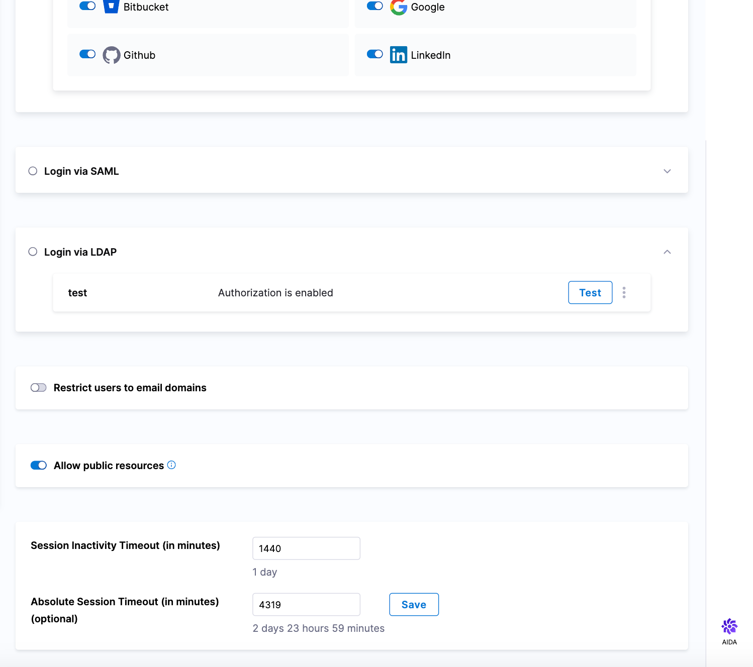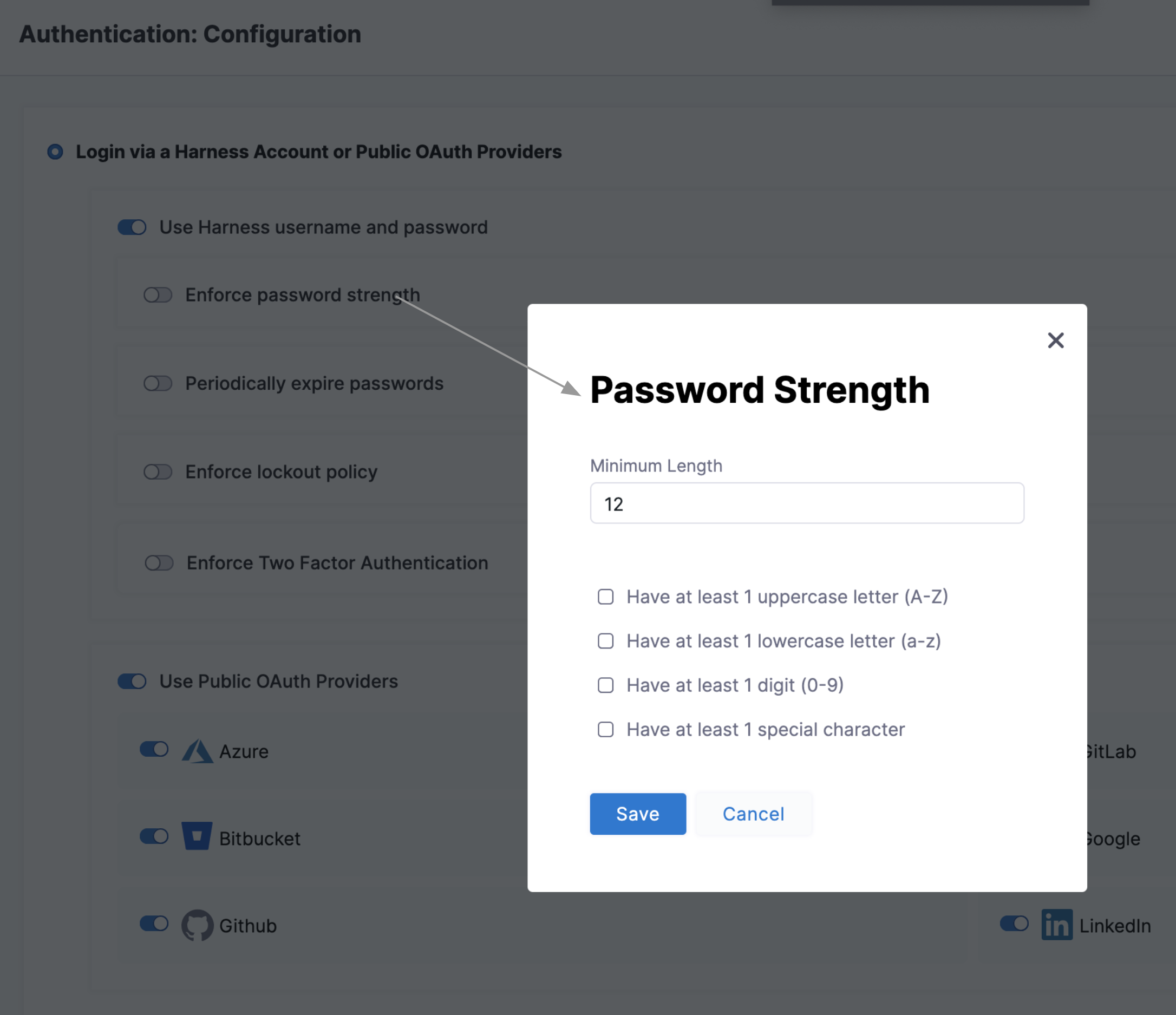 In the Use Public OAuth Providers section, you can enable Harness logins via a range of single sign-on mechanisms. Enable this slider to expose sliders for enabling individual OAuth partners. For more on OAuth Providers, go to Single Sign-On with OAuth.