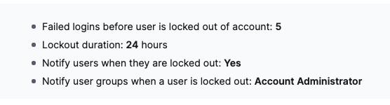 Select Enforce lockout policy to open the dialog shown below. It offers independent controls over the lockout trigger (how many failed logins), lockout time (in days), and notifications to locked-out users and to Harness user groups.