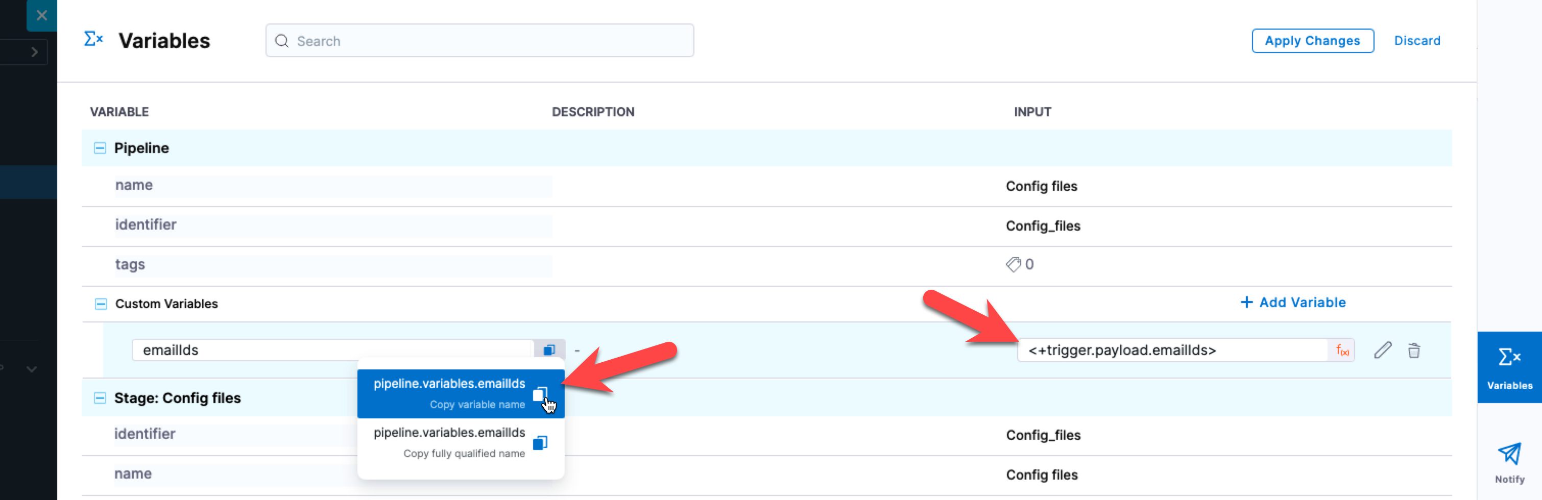 In the target pipeline, create a pipeline variable named emailIds that uses the <+trigger.payload.emailIds> expression.
