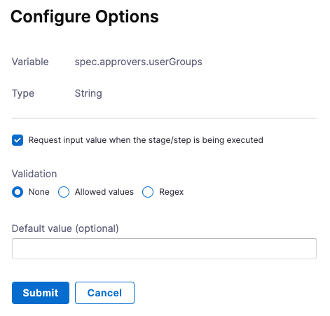 To change the approval group during the pipeline run, edit the Manual Approval step and set the User Group field to use execution input.