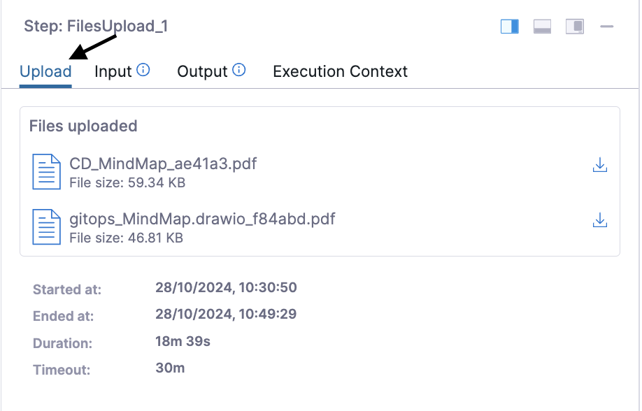 uploadedby: The email of the user who uploaded the files.filesname: The name of the uploaded file in your storage, which follows the path format:accountID/runtimeFileInputData/planExecutionId/nodeExecutionId/fileName. An underscore followed by 6 alphanumeric characters is appended to thefileName. This exact name, including the appended characters, must be used in the download API.