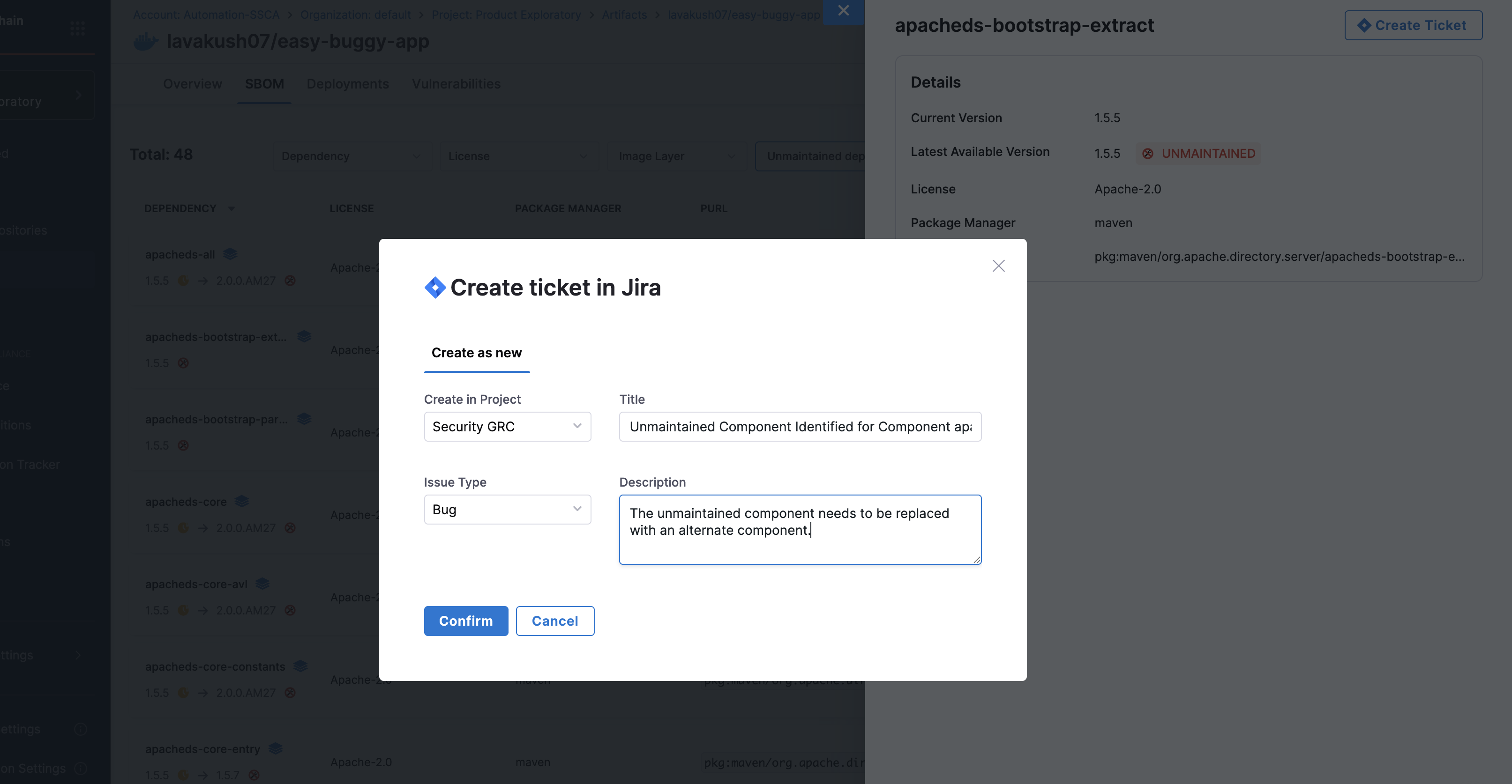 • Select the outdated/unmaintained dependency, close to EOL or EOL components, which will open a side panel. Click on Create Ticket.